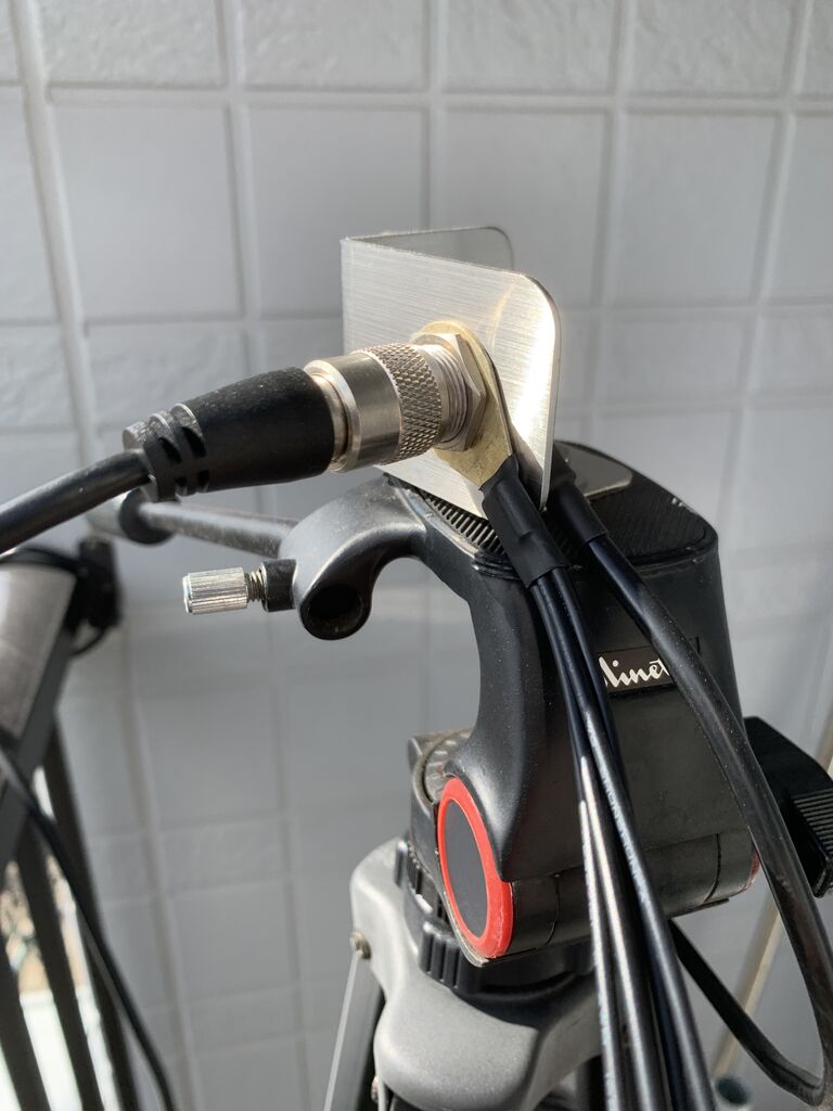 配線は、同軸ケーブルの芯線だけ使用。このケーブルをホイップアンテナ用の基台に接続してそこにカウンターポイズをかませます。基台の固定には今は使っていないビデオカメラ用の三脚を流用しました。