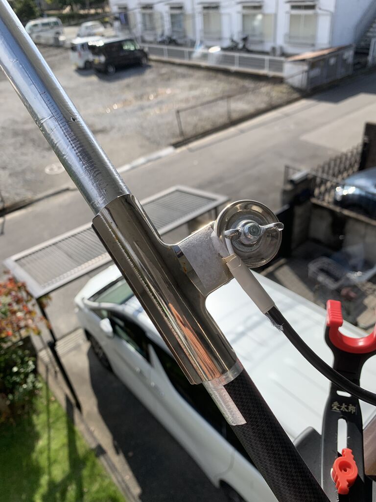 カーボンは導電性ですが高抵抗なのでアルミを巻いた方が高周波電流の流れが良いとの情報もあるので約半分の部分にアルミテープを巻きました。接合部分には雨水対策としてエアコンの配管用テープを巻いています。アルミテープを巻くと必然的にアルミテープ部分は縮めることが出来なくなります。